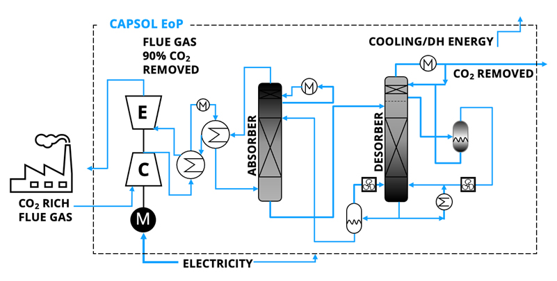 Die Capsol EoP-Technologie arbeitet mit heissem Kaliumcarbonat (Hot Potassium Carbonate = HPC), das ohne Risiko für Mensch und Umwelt verwendet werden kann. Ebenso ist der Betriebsstoff wesentlich kosteneffektiver verfügbar. Die Technologie wird im EoP-Verfahren im Anschluss an das WtE-Verfahren angefügt und mit von der WtE-Anlage produziertem Strom bzw. einer Kombination von Strom und Dampf aus der Anlage betrieben. Die Installation und Inbetriebnahme der komplett eigenständigen Systeme erfolgen ohne Betriebsunterbrechung der WtE-Anlage. Das CO2 kann im Nachfolgeprozess verflüssigt und gespeichert oder auch im Rahmen einer Methanisierung genutzt werden. Dank eines patentierten Wärmerückgewinnungsverfahrens arbeitet die Technologie sehr effizient in Bezug auf die Betriebskosten. Der Energieaufwand für die Abscheidung liegt je nach Installation bei ca. 200 kWh pro Tonne.