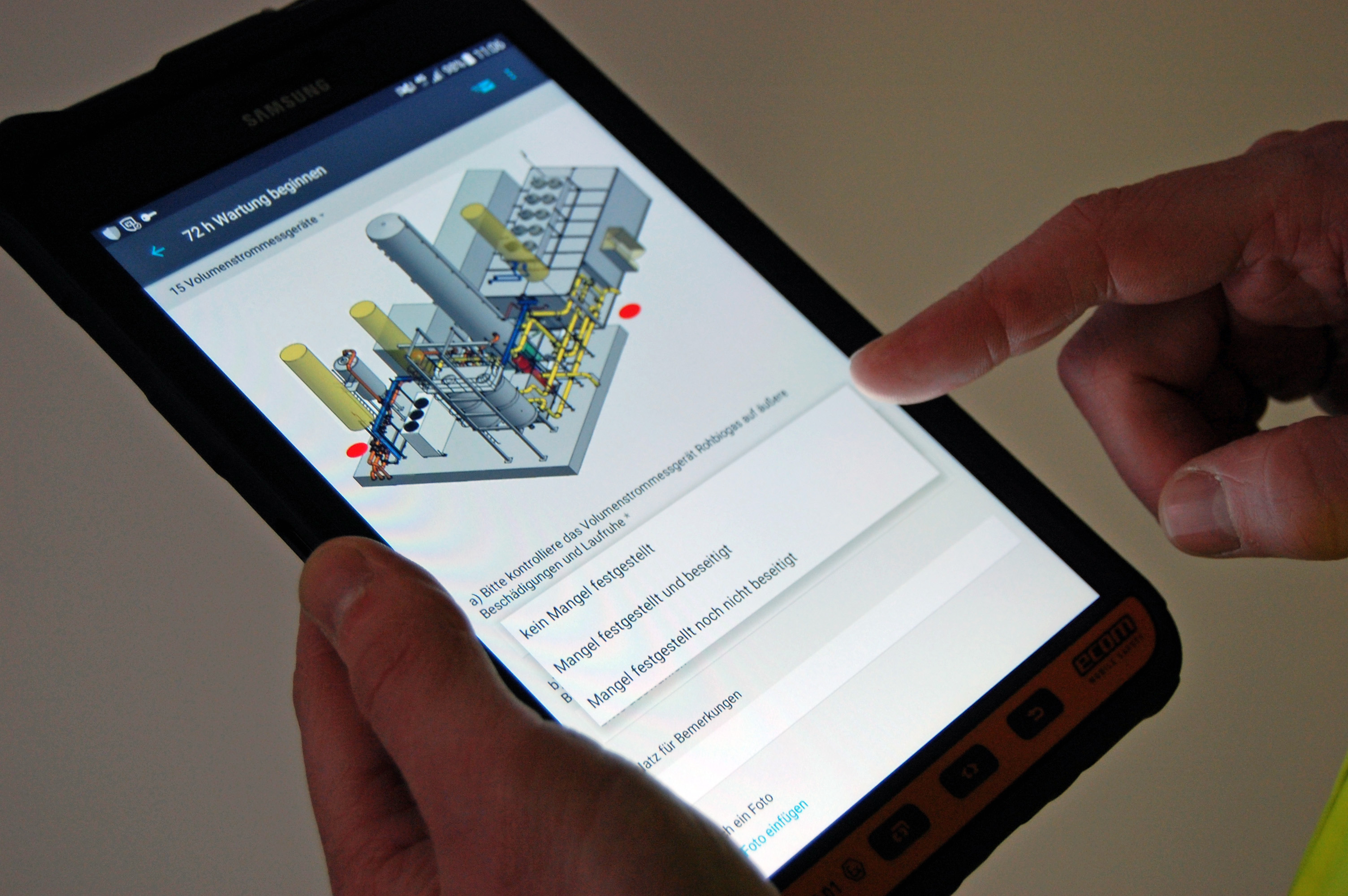 Die Begehung im Rahmen der vorgeschriebenen 72-Stunden-Wartung wird tatsächlich „easy going“: Die intuitiv bedienbare App visualisiert den wiederkehrenden Rundgang auf der Anlage mittels 3D-Ansichten und führt den Bediener entlang der rund zwanzig zu kontrollierenden Komponenten. So ist auch neues Betriebspersonal schnell mit der ordnungsgemässen, vollständigen Ausführung vertraut.