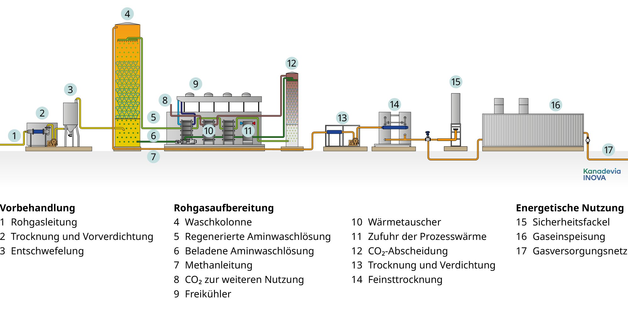Abhängig von der Zusammensetzung des Rohgases erfolgt eine Vorbehandlung. Anschliessend wird im Hauptprozess das im Gasstrom enthaltene CO2 vom Methan abgetrennt und das so erzeugte Biomethan auf die geforderten Qualitätsparameter konditioniert. Je nach Anforderungen und Rahmenbedingungen bietet Kanadevia Inova für diese Trennung zwei Prozesse: die Aminwäsche oder die Membrantechnologie. Beide Verfahren garantieren höchste Qualität und maximale Methanreinheit.