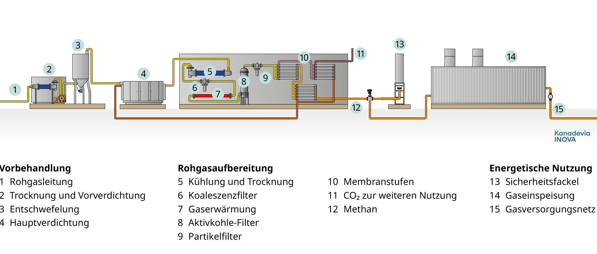 In Zeiten von Energiewende und Dekarbonisierung spielen die umfassende, zuverlässige Versorgung mit erneuerbarer Energie und die Produktion von regenerativem Treibstoff (bio-LNG, bio-CNG) eine zentrale Rolle. Als integrierte Komplettlösung in Kombination mit einer Kompogas®-Anlage oder als Einzelmodul vervollständigt die BioMethan-Gasaufbereitungstechnologie von Kanadevia Inova die Produktpalette, in der aus Abfall und Biomasse aller Art Energie erzeugt wird. So entsteht auf Basis biogener Rohgase im Aufbereitungsprozess hochreines Biomethan als vielseitig nutzbarer Energieträger.