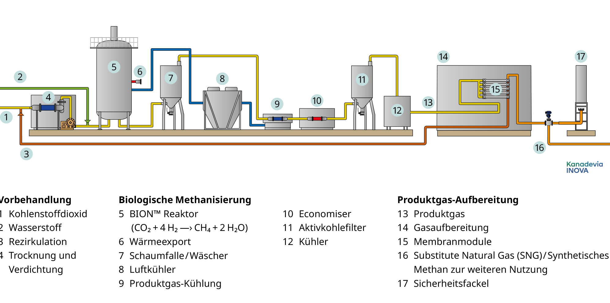 Unsere katalytische Methanisierung wandelt Wasserstoff und Kohlendioxid in synthetisches Methan und Wasser um. Dafür kann eine breite Palette von CO2-Gasquellen (Biogas, Synthesegas oder reines CO2) eingesetzt werden.