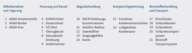 Im ersten Kesselzug erfolgt eine Verringerung der Stickoxide bei einer Abgas-Temperatur von 850–900 °C durch das patentrechtlich geschützte, patentierte, selektive, nichtkatalytische Reduktionssystem (SNCR). Das System nutzt Ammoniaklösung als Reduktionsmittel. Am Kesselauslass wird die Abgas-Temperatur auf etwa 190 °C reduziert, dies ist notwendig, um die Gefahrstoffe, beispielsweise Dioxine oder Schwermetalle, aus dem Abgas mit dem patentrechtlich geschützten, patentierten, halbtrockenen System sicher und effektiv zu entfernen. Mit der bewährten Abgas-Behandlung hält die Anlage unter allen Betriebsbedingungen die zulässigen Emissionsgrenzwerte vollständig ein. Als Reagenzien werden Löschkalk und Aktivkohle eingesetzt. Die bei der Abgas-Behandlung anfallenden Partikelreststoffe werden durch einen Gewebefilter zurückgehalten und zur