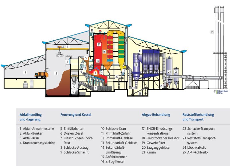 Partikel werden in dem Gewebefilter zurückgehalten. Die bei der Abgas-Behandlung entstehenden Reststoffe werden dann entweder recycelt oder zur sicheren Entsorgung in eine geeignete Einrichtung gebracht. Das gereinigte Abgas wird schliesslich durch den dritten Kamin in die Atmosphäre abgegeben.