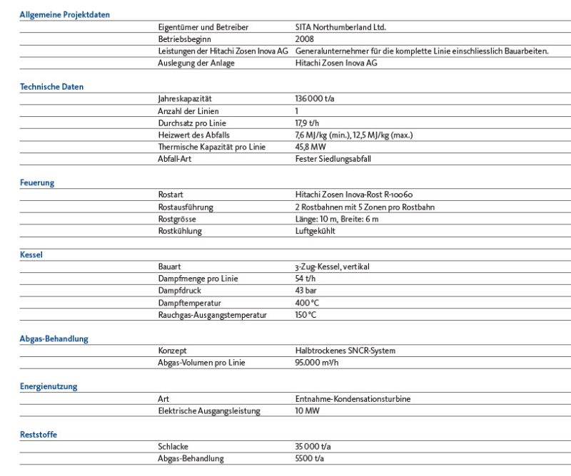 Die Erweiterung der Waste-to-Energy-Anlage Teesside erfolgt durch SITA Northumberland Ltd., ein Joint Venture aus Sita UK, RBS und AXA, das mit dem Northumberland County Council einen PFI-Vertrag mit 25 Jahren Laufzeit abgeschlossen hat. Von Roll Inova, heute Kanadevia Inova AG, übernahm die Rolle des EPC-Auftragnehmers und lieferte die komplette Anlage schlüsselfertig. Die Bauarbeiten begannen im April 2007, die Montage der Grossteile im November 2007, 2009 wurde die Einrichtung übergeben.