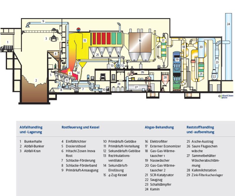 Kessel mit Kraft-Wärme-Kopplung, eine Abgas- Behandlungsanlage zur Gewährleistung geringer Emissionen sowie eine Anlage zur Rückgewinnung von Wertstoffen.