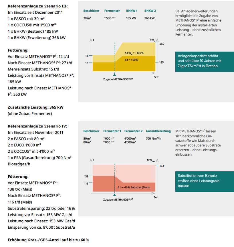 METHANOS® F3 wird in Rundfermentern (Nassfermentation), Pfropfenstromfermentern und Garagenfermentern (Trockenfermentation) erfolgreich eingesetzt. Dabei kommen verschiedene Substrat- Variationen – von NawaRo über Wirtschaftsdünger bis zu organischen Reststoffen wie Bioabfall – zum Einsatz. Das Produkt kann in verschiedenen Biogasanlagen, unabhängig von der Grösse und Substratmischung, problemlos eingesetzt werden.