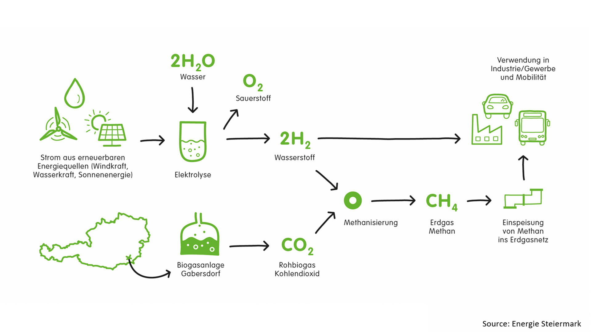 The methanation plant in Gabersdorf is part of “Renewable Gasfield”, a research project for a carbon-neutral Austria. It implements a holistic power-to-gas approach combining multiple renewable energy technologies, taking regional conditions into account, to enable green power to be stored.