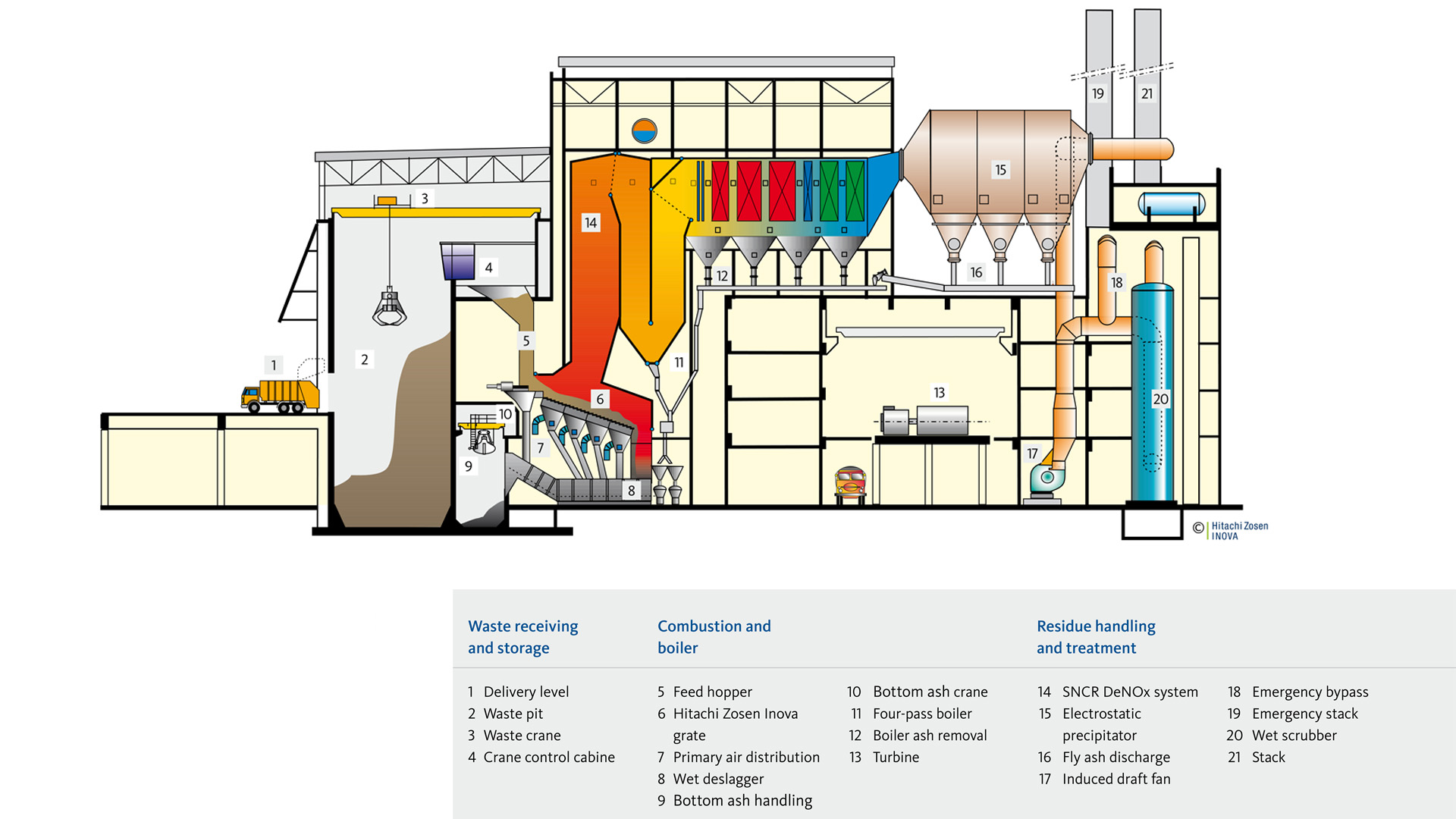 • Flue gas treatment: SNCR DeNOx, electrostatic precipitator, induced draft fan, Kanadevia Inova wet scrubber