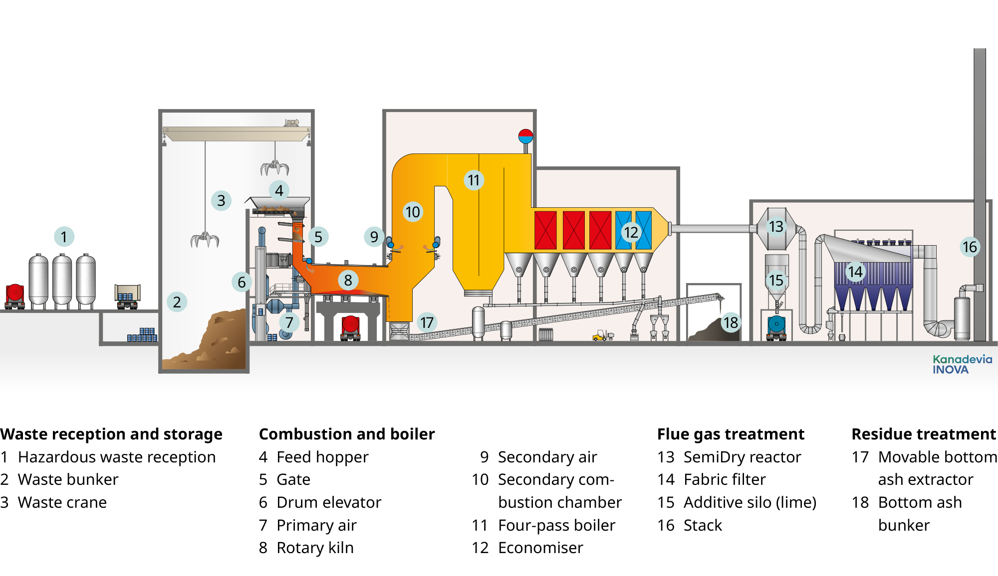 Treating hazardous waste is about the safe incineration (destruction) of the dangerous material contained in the hazardous waste. Moreover, issues such as the circular economy and energy recovery are also increasingly important. To incinerate hazardous waste, a higher temperature of 1,100 °C must be ensured compared to the 850 °C which must be maintained for municipal waste treatment. With a few exceptions, the rotary kiln with a secondary combustion chamber is used as a combustion system. It has proven itself in practice with more than fifty years of operational experience. Installations for hazardous waste are a special segment in the thermal treatment of waste. Each plant has its requirements and requires individual planning. Kanadevia Inova is your professional partner – from the concept phase to engineering, construction to commissioning and maintenance throughout the plant’s entire life cycle.