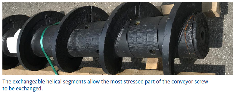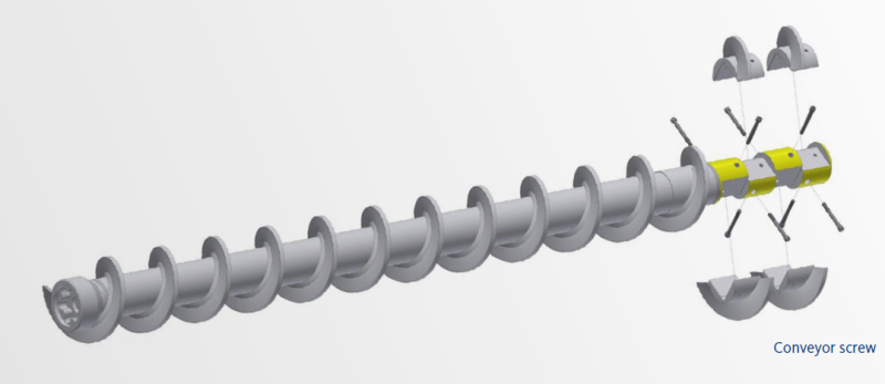 Die wechselbaren Wendelsegmente der Schneckenwelle können von einer einzelnen Person mit wenigen Handgriffen ausgetauscht werden. So wird zeitaufwändiger und kostenintensiver Unterhalt vermieden. Bewährt im Betrieb seit 2021.
