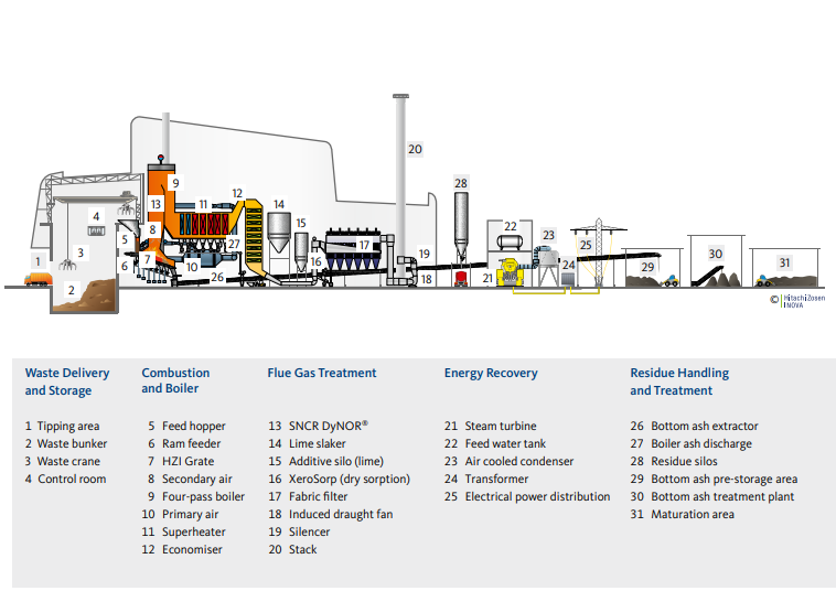 At the heart of the plant will be Kanadevia Inova’s tried-and-tested, air-cooled reciprocating grate (R series) – albeit a version on an unprecedented scale. Measuring 12 x 15 metres, it will be the largest ever built by Kanadevia Inova, and each of its five lines will have a nominal waste throughput of 47 t/h. The heat generated through combustion will be used to create superheated steam in a four-pass boiler. This steam will drive a turbine producing electricity, which will be fed into the local grid. The bottom ash resulting from combustion will be processed to recycle the metals it contains, and the mineral component will be usable as a construction material, for example in road building. To ensure that a plant of this size, which must also handle an extremely diverse mix of waste types, can be operated reliably, Kanadevia Inova will employ its enhanced combustion control system CCS+. This will adjust combustion in line with the composition of the waste fed in and optimise burnout, ensuring that the reduction of nitrogen oxides meets the highest quality standards even in the combustion phase. In combination with XeroSorpdry sorption flue gas treatment, this will mean that emissions not only comply with the legal limits, but in fact fall below them.
