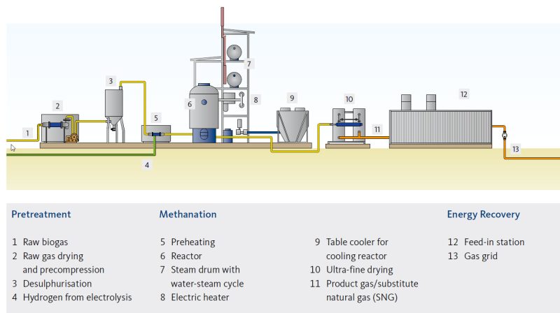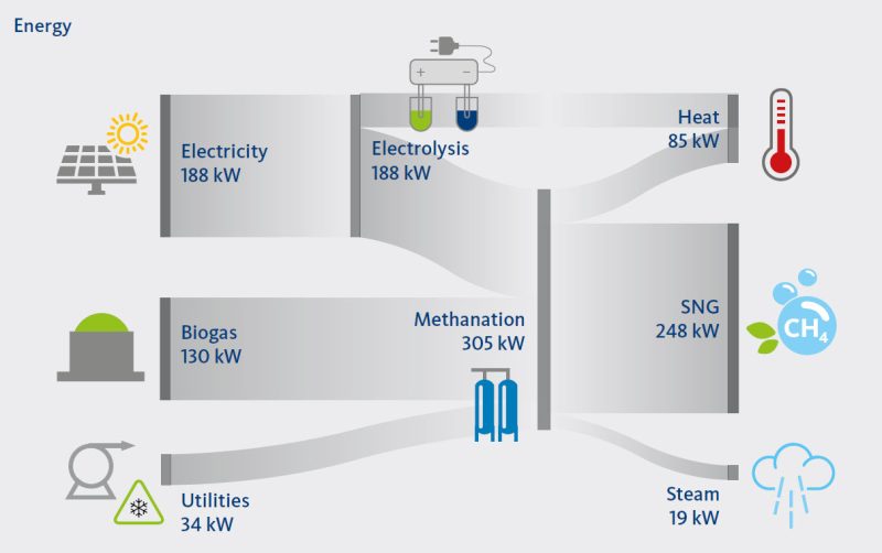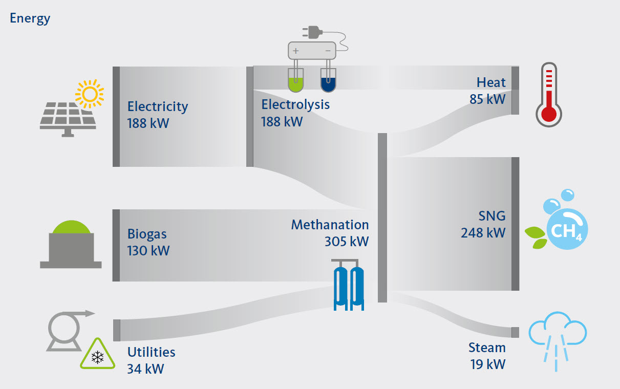 Meist wird dies mittels Gasaufbereitung vom Methan abgetrennt und so Biomethan erzeugt. Bei diesem Projekt hingegen wird das CO₂ nicht abgespalten, sondern es reagiert in der Methanisierungseinheit mit dem grünen Wasserstoff zu synthetischem Methan (SNG; engl.: synthetic/substitute natural gas). Es wird regelwerkskonform ins Gasnetz eingespeist und ersetzt fossiles Erdgas.