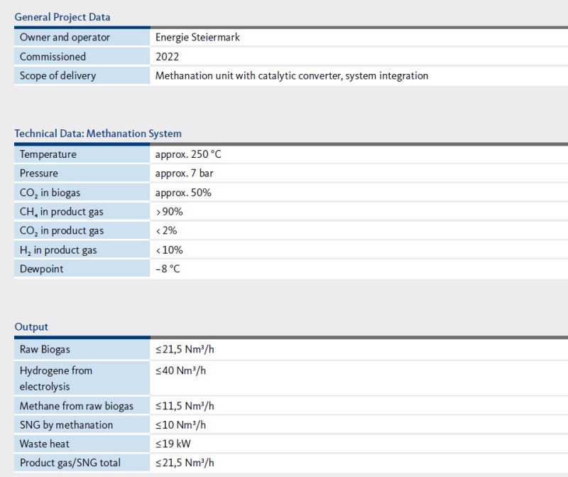 Die Methanisierungsanlage des Gabersdorf-Projekts kann flexibel sowie kontinuierlich betrieben werden. Sie erzeugt bis zu 21 Nm³/h einspeisefähiges Produktgas. Das entspricht dem durchschnittlichen Jahreswärmebedarf von etwa 60 Vier-Personen-Haushalten. Grundsätzlich ist die Technologie skalierbar und bietet somit Potenzial für die Erzeugung grösserer Methanmengen.