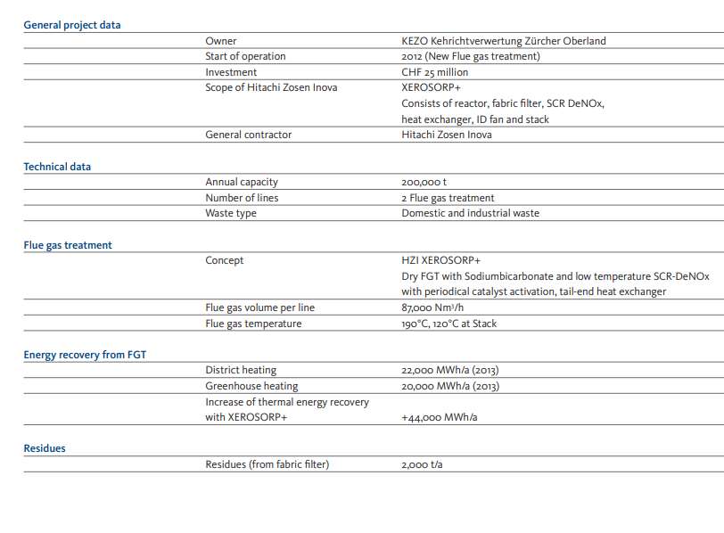 space required than a conventional FGT plant in just 15 months following the contract signature. The transition from the existing to the new flue gas treatment took less than 72 hours. An extra highlight is the increase in energy efficiency, with approx. 220 kWh more energy recovered per ton of treated waste. The installation at KEZO Hinwil opened the way for further applications of this innovative technology.