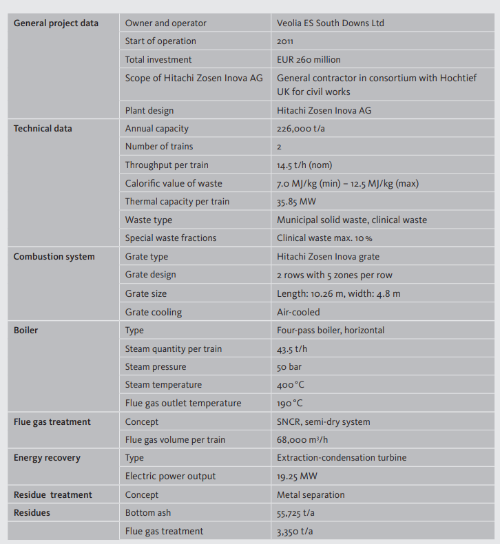 Planning for this project was achieved by the owner and operator, Veolia ES South Downs Ltd., a subsidiary of Veolia Environmental Services. Von Roll Inova, today’s Kanadevia Inova AG, has assumed the role of leader in a consortium with Hochtief UK and provides the complete electro-mechanical part of the facility. Construction started in 2008 and the facility will be handed-over in 2011.