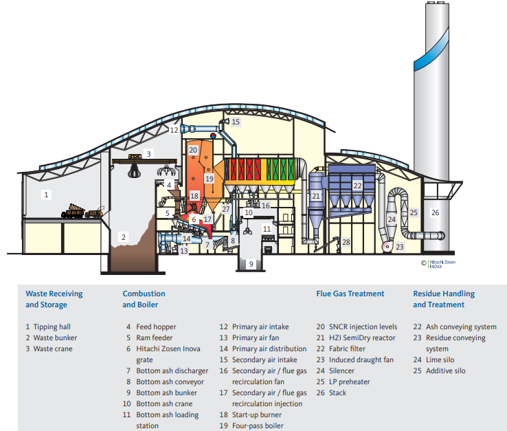 Nachdem die verschiedenen Recyclingmaterialien durch Recyclingprogramme direkt vor Ort und das Netzwerk der Recyclingsammelstellen für Haushalte aussortiert wurden (eine neue MRF-Anlage für 85.000 Tonnen /Jahr wird zurzeit errichtet), kann der Restabfall an die Waste-to-Energy-Anlage geliefert werden. Nur 15 % des Abfalls werden direkt durch Lkw am Standort angeliefert. Die übrigen 85 % des Abfalls werden durch Schiffe am Standort angeliefert. An der Annahmestelle werden die Behälter auf Lkw umgeladen und dann in der Abfallhandlinghalle in einen Bunker gekippt. Der Abfall wird im Bunker durch einen Kran gründlich gemischt und dann in einen der Einfülltrichter der drei Verbrennungslinien transportiert. Zu jeder Linie gehört ein 4-Zug-Kessel mit einer Wärmekapazität von 79,5 MW. Der Abfall fällt über einen Fallschacht auf einen Rost mit vier Bahnen. Der Vorschubrost mischt und bewegt den Abfall und gewährleistet so eine optimale Verbrennung der verschiedenen Abfall-Fraktionen. Eine vollintegrierte Verbrennungsleistungsregelung gestattet die kontinuierliche Anpassung der Verbrennungsbedingungen im Interesse eines möglichst sicheren und effizienten Betriebs. Das Verfahren reduziert das Volumen des angelieferten Abfalls um bis zu 90 %. Die entstehende Schlacke wird über den Schlackenaustrag zum Schlackenabtransport transportiert. Die Kesselschlacke wird in Spezialbehälter verladen,