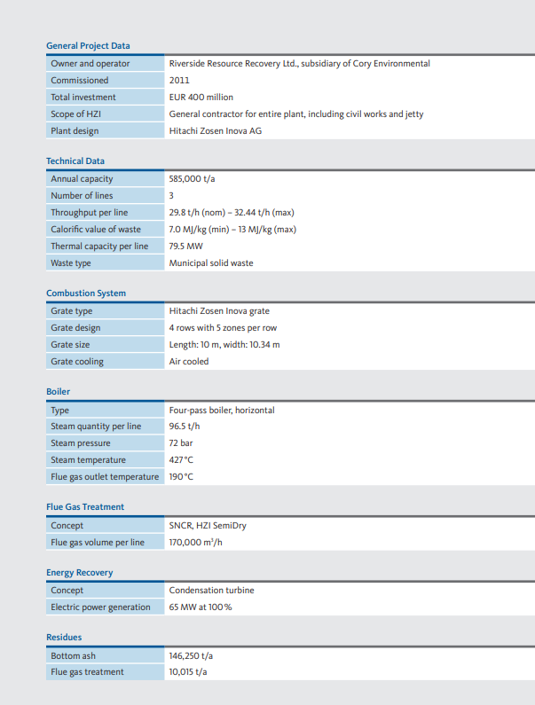 Nach der Planung im Jahr 2006 sowie einer zweistufigen Ausschreibung, die Kanadevia Inova Anfang 2007 für sich entscheiden konnte, wurde das Projekt erfolgreich entwickelt. Die zweite Stufe bestand aus einem offenen Ausschreibungsverfahren für die Bauarbeiten in Absprache mit dem Kunden. Nach der Entscheidung über den Unterauftragnehmer für die Bauarbeiten Ende 2007 wurde die Finanzierung am 31. Juli 2008 entschieden. Die Anlage ist Eigentum der Riverside Resource Recovery Ltd., einer Tochtergesellschaft